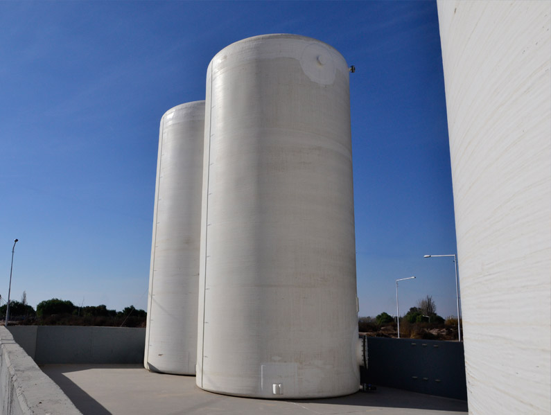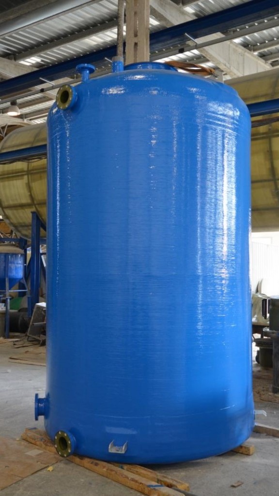 Tanques cilíndricos verticales y horizontales fabricados en plásticos reforzados con fibra de vidrio. (P.R.F.V.) construidos por sistemas de FILAMENT WINDING, dicho sistema comprende el enrollamiento de mechas de fibra de vidrio saturadas con resinas específicas según el líquido que se contenga en el mismo. Los tanques se construyen según normas ASTM 3299 B, ASTM , DIN . Los tanques son aptos para contener productos alimenticios, productos corrosivos, según la resina que se utilice.